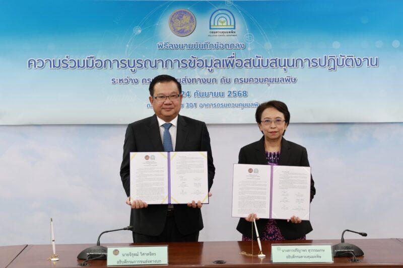 กรมควบคุมมลพิษ (คพ.) และกรมการขนส่งทางบก (ขบ.) ได้ร่วมลงนามบันทึกข้อตกลงความร่วมมือ (MOU) บูรณาการข้อมูลเพื่อสนับสนุนการปฏิบัติงานในการตรวจสอบและบังคับใช้กฎหมายกับยานพาหนะเพื่อแก้ไขปัญหาฝุ่น PM 2.5 ณ ห้องประชุม 301 ชั้น 3 กรมควบคุมมลพิษ โดยสาระสำคัญของความร่วมมือ มุ่งเน้นการแลกเปลี่ยนและเชื่อมโยงข้อมูลที่เกี่ยวข้องกับยานพาหนะ อาทิ ข้อมูลทะเบียนรถ ใบอนุญาตขับรถ การตรวจสภาพรถ และผลการตรวจวัดมลพิษ รวมถึงข้อมูลอื่น ๆ ที่ใช้ในการติดตามตรวจสอบ เพื่อจัดทำระบบฐานข้อมูลกลางสำหรับการห้ามใช้ยานพาหนะที่ไม่เป็นไปตามมาตรฐาน พร้อมทั้งให้เจ้าของหรือผู้ครอบครองรถแก้ไขปรับปรุงเครื่องยนต์ให้ได้มาตรฐาน เพื่อนำไปสู่การยกเลิกคำสั่งห้ามใช้งาน อนึ่ง ความร่วมมือดังกล่าวยังครอบคลุมการพัฒนาศักยภาพบุคลากรการแลกเปลี่ยนองค์ความรู้ด้านการตรวจสอบ วิเคราะห์ ประมวลผล รวมถึงการประยุกต์ใช้เทคโนโลยีใหม่ ๆ ในการสนับสนุนภารกิจของทั้งสองหน่วยงาน