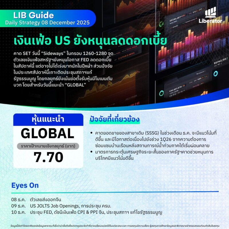 วันที่ 8 ธันวาคม 2568 บริษัทหลักทรัพย์ ลิเบอเรเตอร์ จำกัด หรือ “Liberator” (บล.ลิเบอเรเตอร์) ออกบทวิ