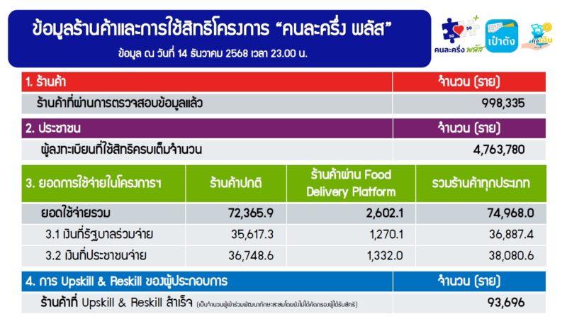 คนละครึ่งพลัสถึง 14 ธ.ค.68 เงินสะพัด 7.4 หมื่นล้านบาท ใช้สิทธิหมดแล้ว 4.7 ล้านราย ร้านค้าอัพสกิลพุ่ง 9.3 หมื่นราย
