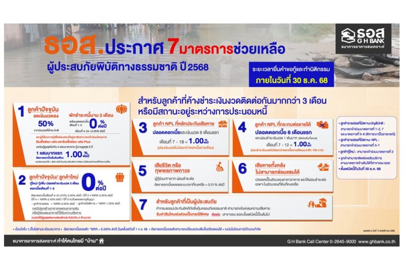 Business headline ธอส.ออกมาตรการพักหนี้-ลดเงินงวด-ลดดอกเบี้ย-เคลมสินไหมเร่งด่วน บรรเทาความเดือดร้อนผู้ประสบภัยน้ำท่วม พฤศจิกายน 14, 2025 ธนาคารอาคารสงเคราะห์…