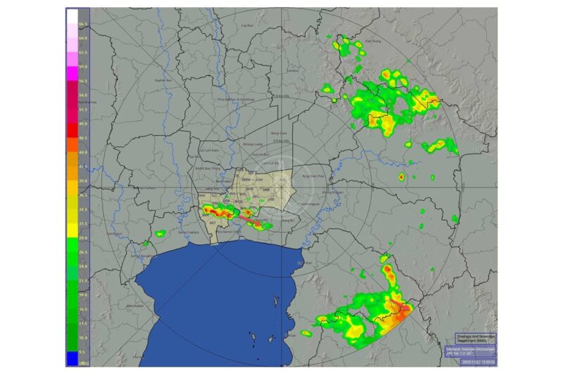 พบกลุ่มฝนเล็กน้อยถึงปานกลาง ฝนหนักบางแห่งบริเวณกรุงเทพมหานคร(ทุกเขตยกเว้นเขตบางบอน หนองแขม บางแค ทวีวัฒนา) สมุทรปราการ ฉะเชิงเทรา ปทุมธานี นครปฐม นนทบุรี พระนครศรีอยุธยา สุพรรณบุรี
