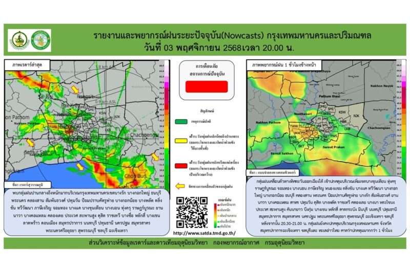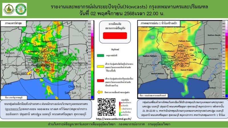 วันที่ 2 พฤศจิกายน 2568 เวลา 14.00 น.ฝนเล็กน้อยถึงปานกลางเขตหนองเเขม บางบอน บางเเค ภาษีเจริญ ราษฎร์บูรณะ บางคอแหลม ยานนาวา สาทร บางรัก พระโขนง บางนา ประเวศ เคลื่อนตัวทิศตะวันออกเฉียงใต้